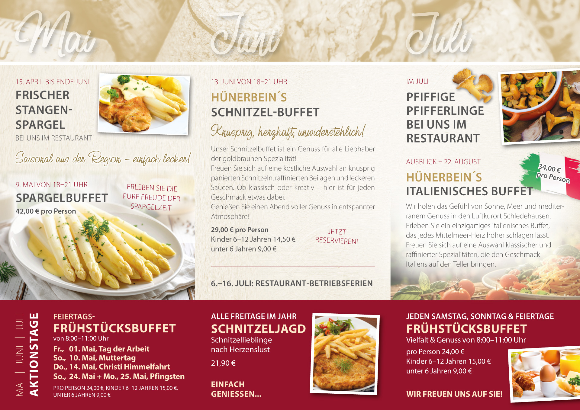 Darüber hinaus bieten wir regelmäßig eigene Events und Themenbuffets – von festlichen Genussabenden bis hin zu saisonalen Highlights. So wird jeder Besuch zu einem besonderen Erlebnis, das Genuss, Geselligkeit und festliche Stimmung verbindet.